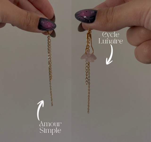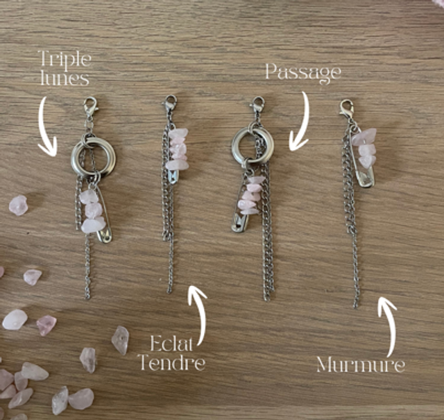 Réalisé à la main, il est orné de breloques amovibles et de quartz rose, pour te permettre de faire évoluer ta pièce selon ton humeur, ton intention ou ton moment de vie.