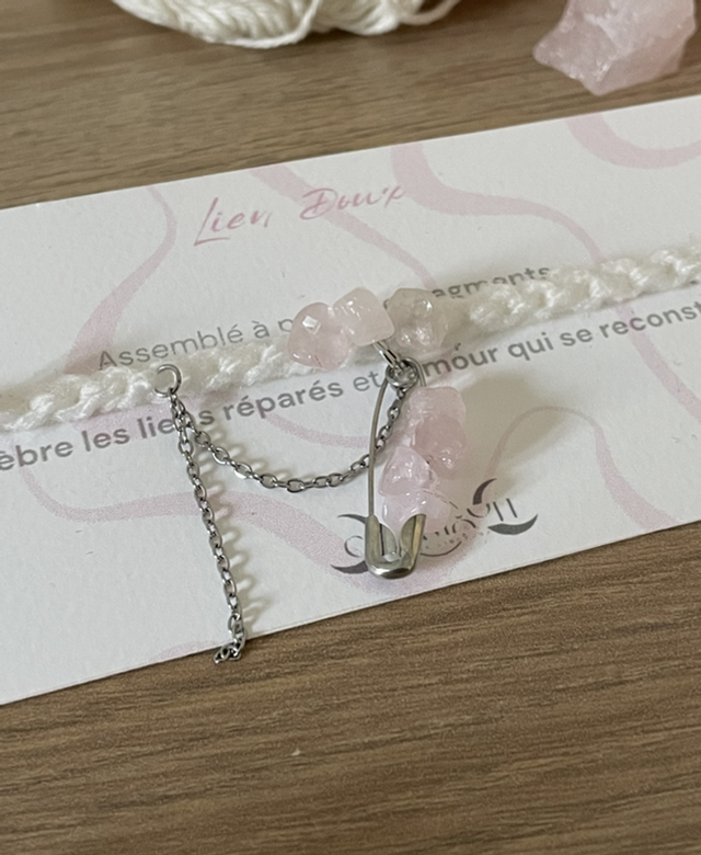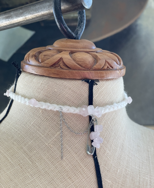Les pierres se multiplient autour du cou et dans l'épingle, comme les émotions que l'on traverse.